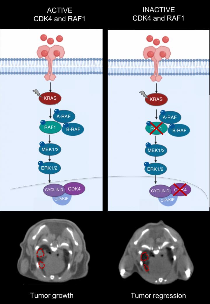The findings shed light on the development of new treatments for tumours with KRAS mutations and indicate the importance of developing inhibitors specifically against RAF1, because the inhibitors developed so far have not made it past phase I on account of their high toxicity.