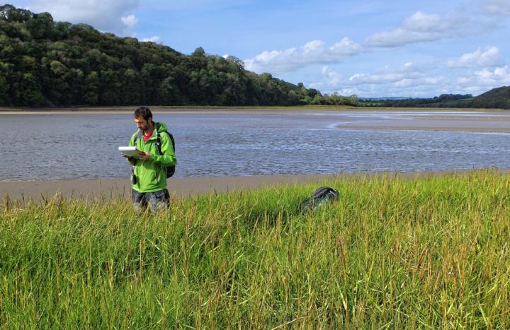 image: Swansea researchers conducting saltmarsh vegetation surveys and recording water levels on the Taf estuary, South Wales. Their study of estuaries shows the flood protection role of coastal wetlands has been under-estimated.