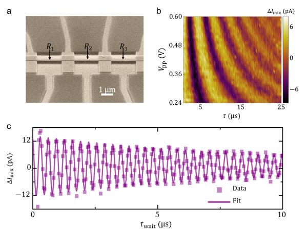 image: a. Scanning electron microscopic image of a tilted sample. b. Rabi oscillations between non-neighbouring coupled mechanical resonators. c. Ramsey interferences between non-neighbouring coupled mechanical resonators.