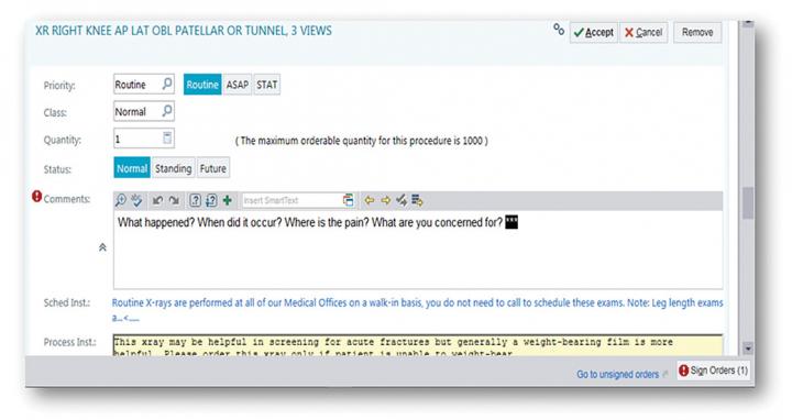 image:Â Screen shot of order entry screen in electronic medical record shows inclusion of history prompts to support ordering providers in providing complete imaging histories. (XR = radiograph, AP = anteroposterior, LAT = lateral, OBL = oblique, ASAP = as soon as possible, STAT = immediately, Sched. = schedule, Inst. = instructions.)
