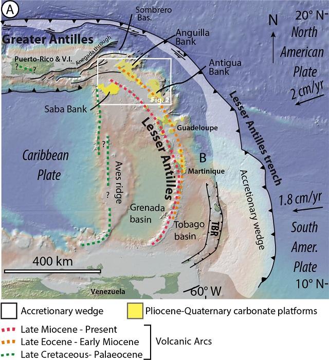 image: Contexte géologique du secteur étudié (rectangle blanc), à la jonction entre la ride d'Aves, les Petites Antilles et les Grandes Antilles