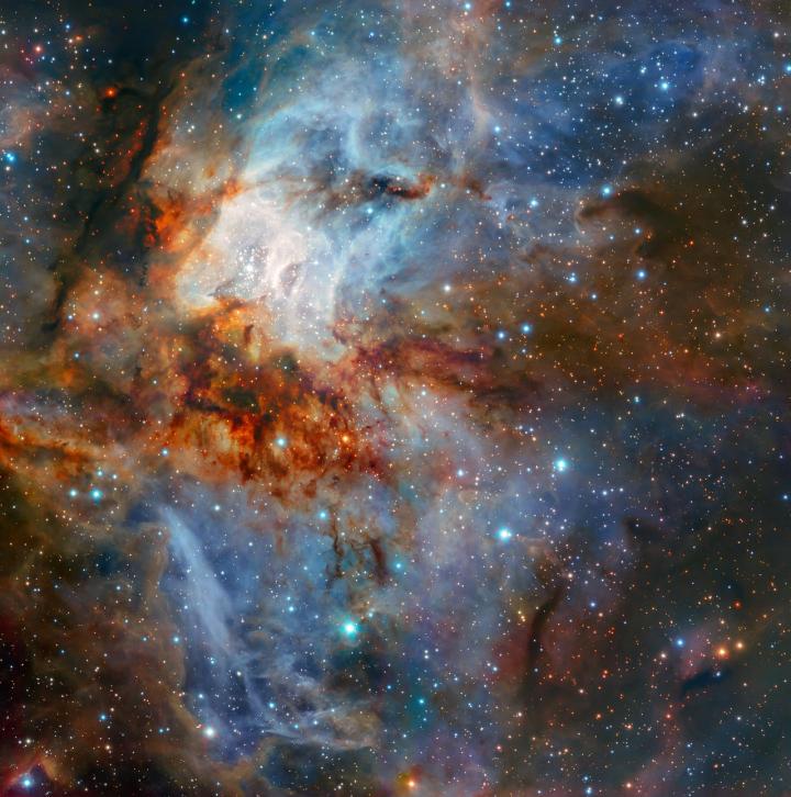 The central area of RCW 38 is visible here as a bright, blue-tinted region, an area inhabited by numerous very young stars and protostars that are still in the process of forming. The intense radiation pouring out from these newly born stars causes the surrounding gas to glow brightly. This is in stark contrast to the streams of cooler cosmic dust winding through the region, which glow gently in dark shades of red and orange. The contrast creates this spectacular scene -- a piece of celestial artwork.