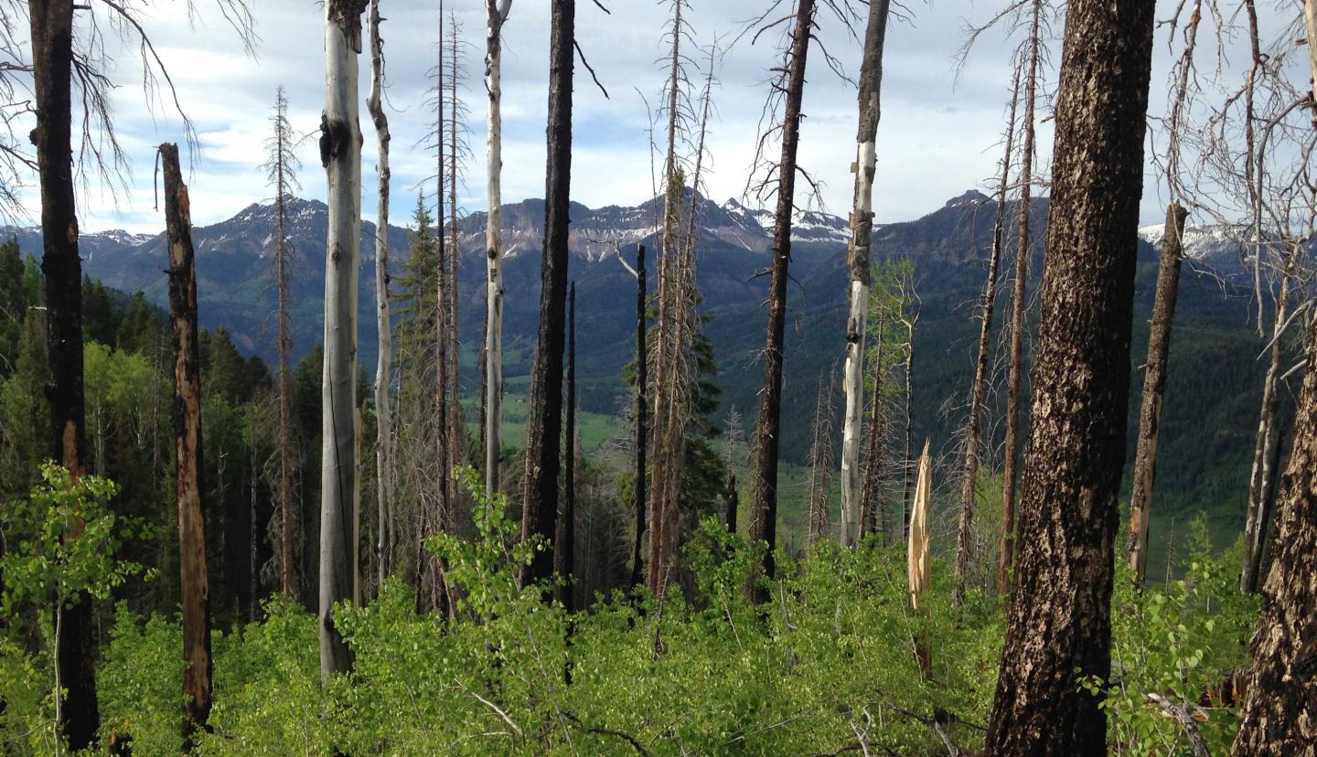 image: A forest in the San Juan range of the Rocky Mountains, with dead Engelmann spruce trees alongside live aspen trees.