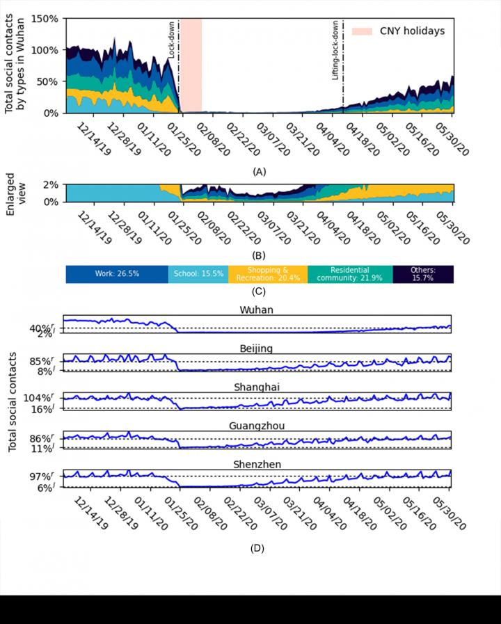 image: (A) Change of TSCI in Wuhan from December 2019 through May 2020 in the form of a percentage of the average pre-lockdown level in December 2019 (100%). (B) The enlarged view of (A) on the part of TSCI between 0% and 2%. (C) The proportions of TSCI that occurred in different coloured categories of places in December 2019. Different colours in (A) and (B) represent the same as those in (C). The two vertical lines in (A) denoting the lockdown and lockdown-lifting dates are only applicable to Wuhan as other cities announced the two dates differently.