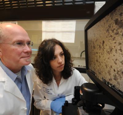 Dr. William E. Rainey confers with Dr. Silvia Monticone, a physician scientist at the University of Torino, Italy. Monticone worked with Rainey for a year in his laboratory at Georgia Health Sciences University on research linking a genetic mutation found in some adrenal gland tumors to increased sodium retention and worsening blood pressure in patients.