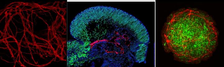 image: Organoid models are often surprisingly similar to real embryonic tissues. Shown here (from left): 3D reconstruction of the vascular network within an organoid, brain organoid with blood vessels (red) and brain stem cells (green) and a tumour organoid with blood vessels (red) and tumour cells (green).