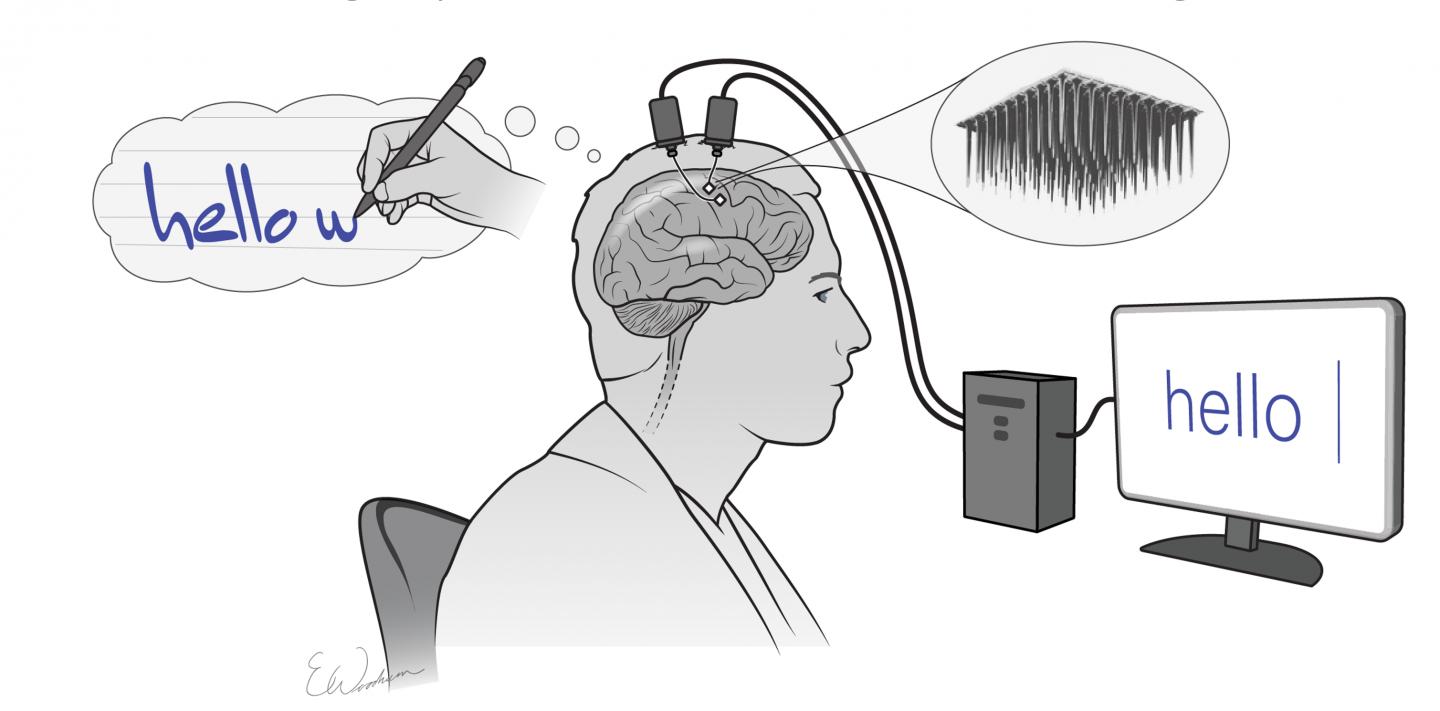 image: Two implanted electrode arrays record the brain activity produced by thinking about writing letters. This information is then collected and processed in real-time by a computer, which converts that data into words on a screen.
