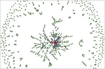 A visualization generated by an agent-based model of New York City's HIV epidemic shows the risky interactions of unprotected sex or needle sharing among injection drug users (red), non-injection drug users (blue) and non-users (green).
