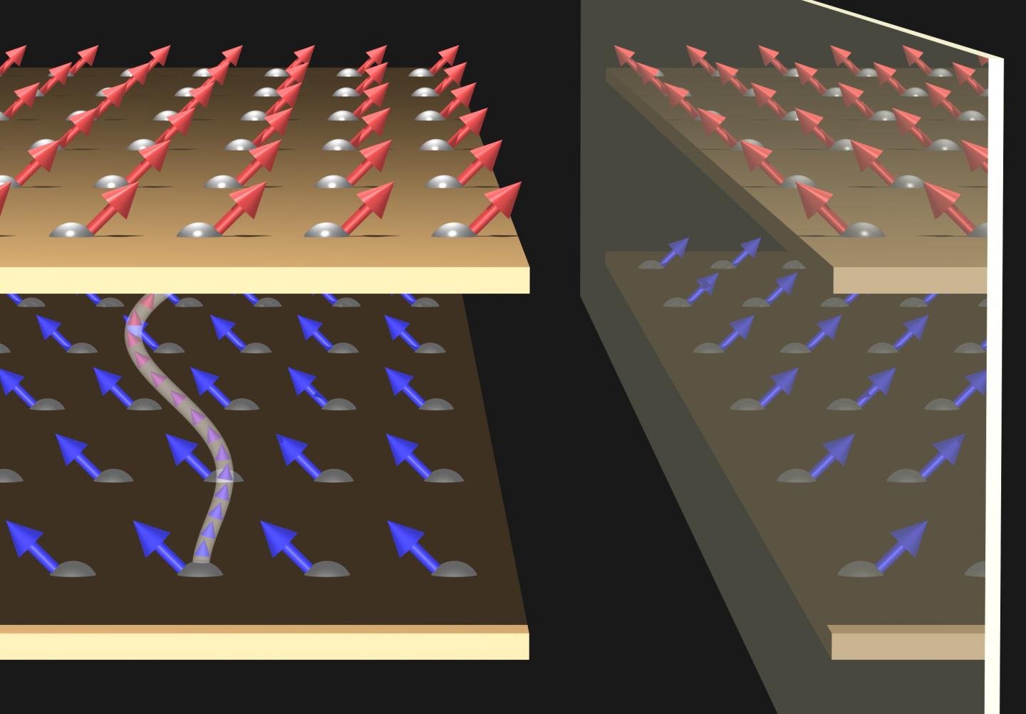 image: The spins (red and blue arrows) in distant magnetic layers can couple due to the discovered long-range interaction, which is illustrated as a white string connecting two spins. This coupling leads to a clockwise canting between the spins in the two layers. Its depicted mirror image with the opposite sense of canting is not found in the considered systems.