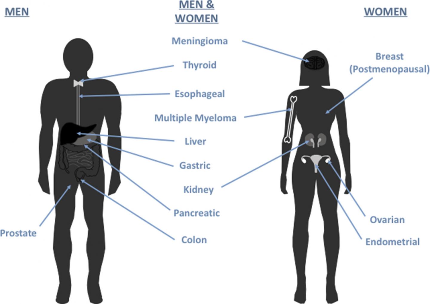 image: Obesity is associated with increased risk of developing and dying from the following cancers: breast (in postmenopausal women), ovarian, liver, gallbladder, kidney (renal cell), colon, pancreatic, gastric, esophageal (adenocarcinoma), endometrial, thyroid, multiple myeloma, and meningioma. Obesity is also associated with progression (but not incidence) of prostate cancer.