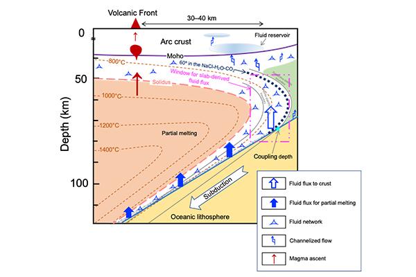image: An illustration showing migration of slab-derived aqueous fluids in subduction zones.