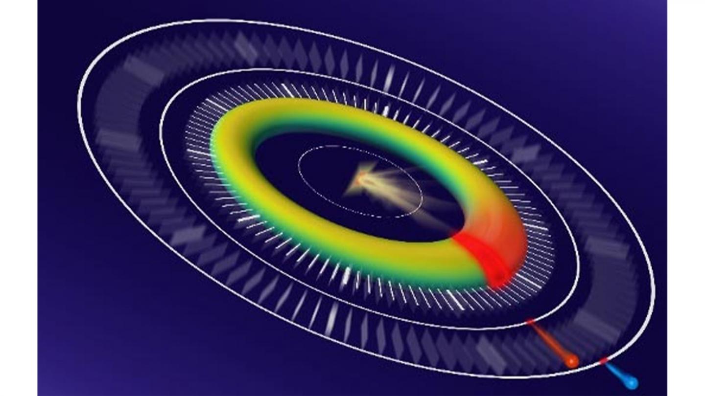 image: Artistic depiction of XFEL measurement with neon gas. The inherent delay between the emission of photoelectrons and Auger electrons leads to a characteristic ellipse in the analyzed data. In principle, the position of individual data points around the ellipse can be read like the hands of a clock to reveal the precise timing of decay processes.