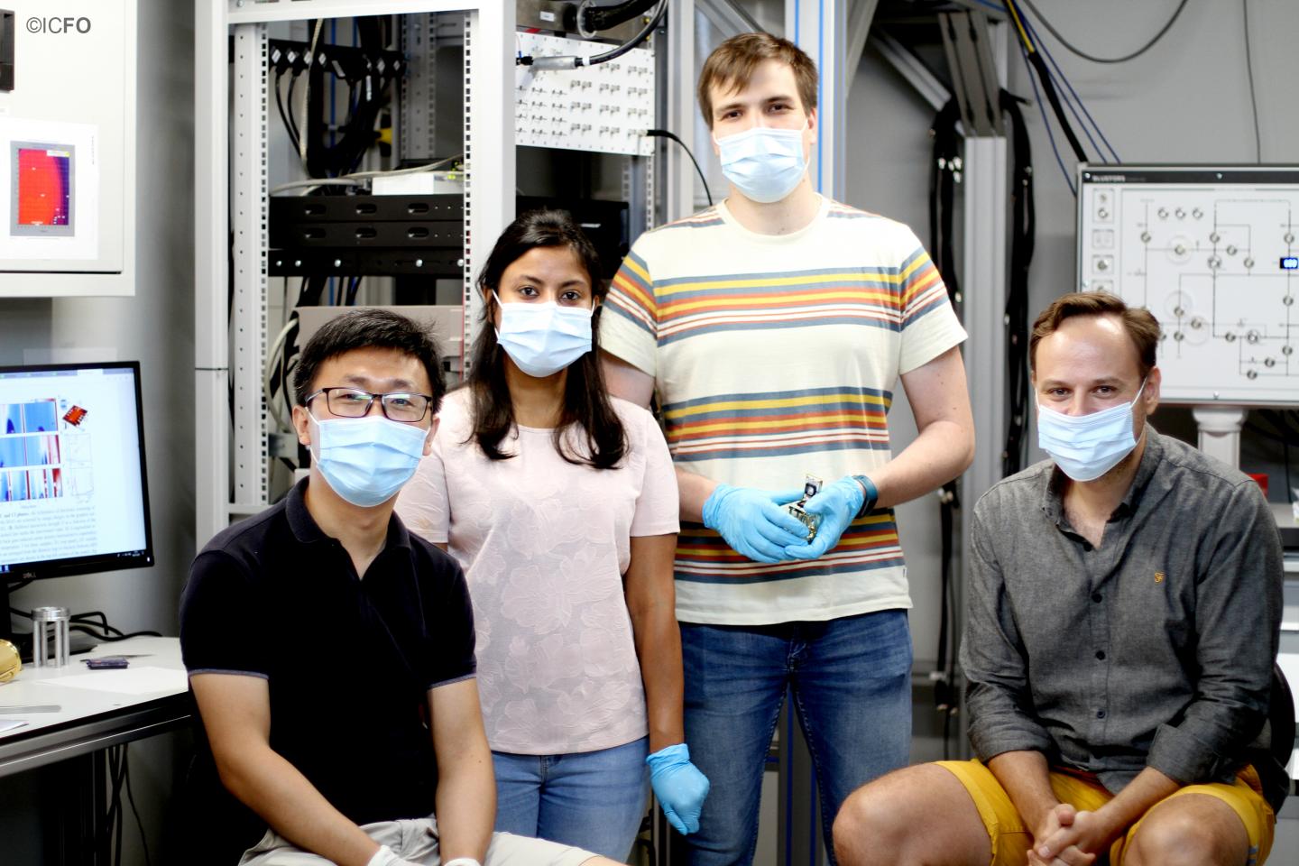 image: Caption: from left to right: Dr. Xiaobo Lu, Ipsita Das, Dr. Petr Stepanov, and Prof. Dmitri Efetov in the lab at ICFO.