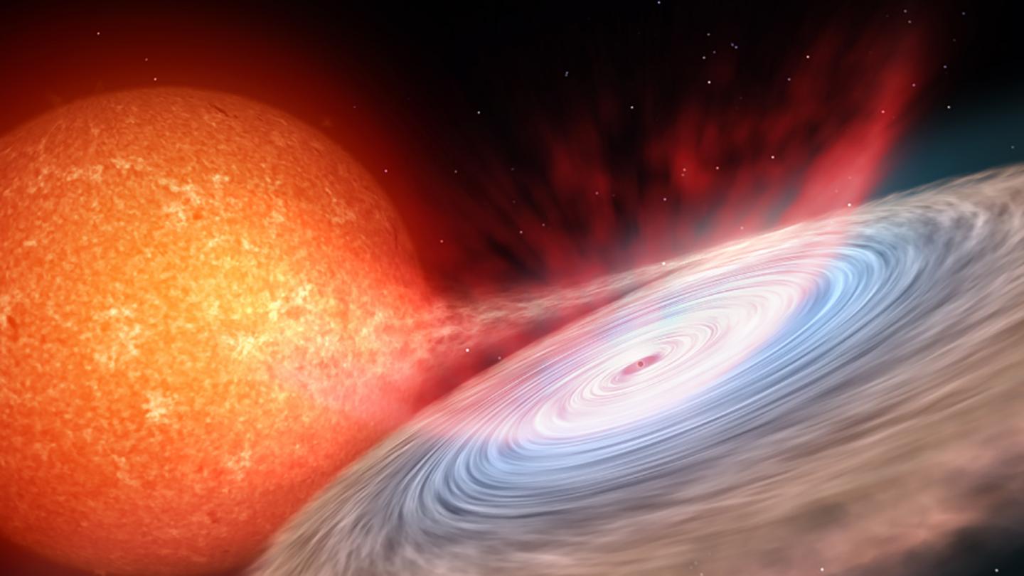 image: Artistic impression of the constant emission of winds produced during the eruption of a black hole in an X-ray binary.