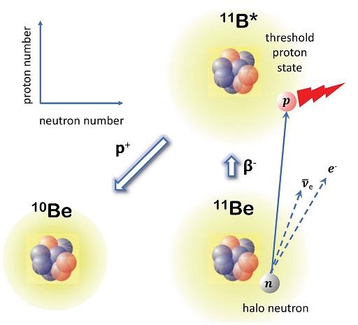 In a recently published paper (Physical Review Letters 124, 042504 (2020)), physicists from the IFJ PAN in Krakow (Poland), GANIL in Caen (France) and FRIB Facility (USA) provided an explanation for proton emission delayed by ß- decay from the weakly bound ground state of the 11Be nucleus. In the first stage of this enigmatic, two-stage process, the neutron in the ground state of 11Be with the halo structure decays into electron, anti-neutrino and proton, causing the transformation of 11Be ground state into the resonance in 11B. In the second stage, a proton is emitted from this resonance (see attached diagram) to the 10Be state. The possibility of such a halo decay process in 11Be has been explained by the existence of resonance in 11B with 1/2+ total angular momentum and parity, which resembles many features of a nearby proton emission channel. The proximity of proton and tritium emission thresholds in 11B suggests that this resonance may also contain an admixture of the tritium cluster configuration.