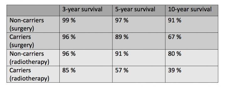 Over 1,300 patients participated in the study, 67 of whom were carriers of BRCA mutations. Patients carrying such mutations who had undergone radiotherapy showed 10-year survival rates of 39%, compared to 80% for non-carriers. Amongst patients who have undergone surgery the difference in 10-year survival rates is less pronounced (91% vs. 67%; see table); the smaller difference in survival rates among carriers and non-carriers who have undergone surgery shows that "these patients may require more long-term monitoring to establish whether or not this difference is significant," argues Castro.