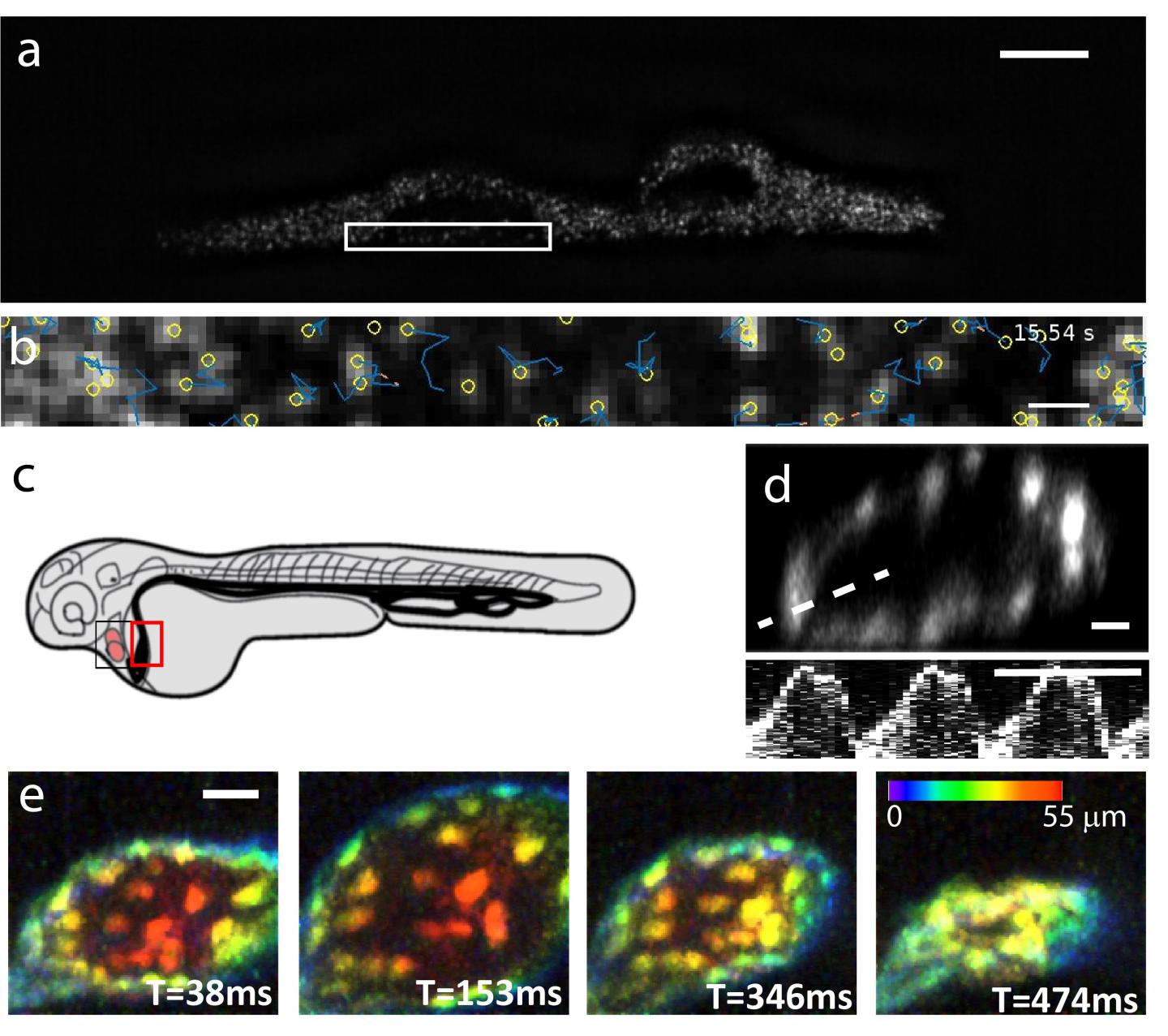 image: a, Genetically encoded multimeric nanoparticles inside two MV3 cells, as imaged by ASLM at 20 ms image integration time, and 3.57 volumes per second. b, YZ view of the perinuclear region. Yellow circles indicate detected vesicles and blue lines illustrate cumulative tracks. c, Schematic drawing of zebrafish embryo. d, Averaged (over 30 cycles) XZ cross section of zebrafish heart, acquired with a framerate of 45 Hz. e, Kymograph of beating heart, measured along line shown in d. Kymograph uses raw data and no averaging was applied. f, Volumetric imaging of a zebrafish heart at a volume rate of 7.4Hz, XY view with depth encoded in color. Scale bar, a, 10 microns; b, 1 microns; d,e 20 microns