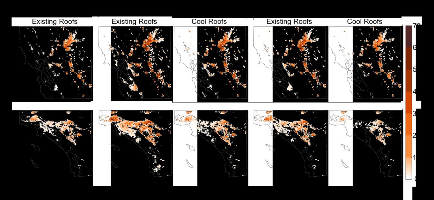 image: In this study, a heat wave consists of at least three consecutive days with maximum air temperature of 35 C or higher. The simulation above illustrates the extent to which cool roofs could reduce annual population exposure to heat waves in Northern and Southern California in mid-century under hot and warm scenarios, driven by high greenhouse gas emissions and more modest emissions, respectively.