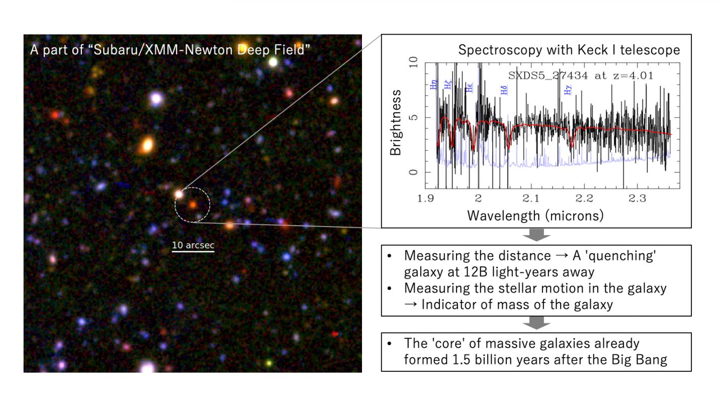 image: The dying galaxy in the Subaru/XMM-Newton Deep Field was observed with MOSFIRE on the Keck I telescope. The top-right panel shows the spectrum at 2 microns, which is invisible to the human eye. The spectrum gives the distance to the galaxy (12 billion years ago) as well as a mass of the galaxy, which turned out to be as massive as the core of galaxies today.