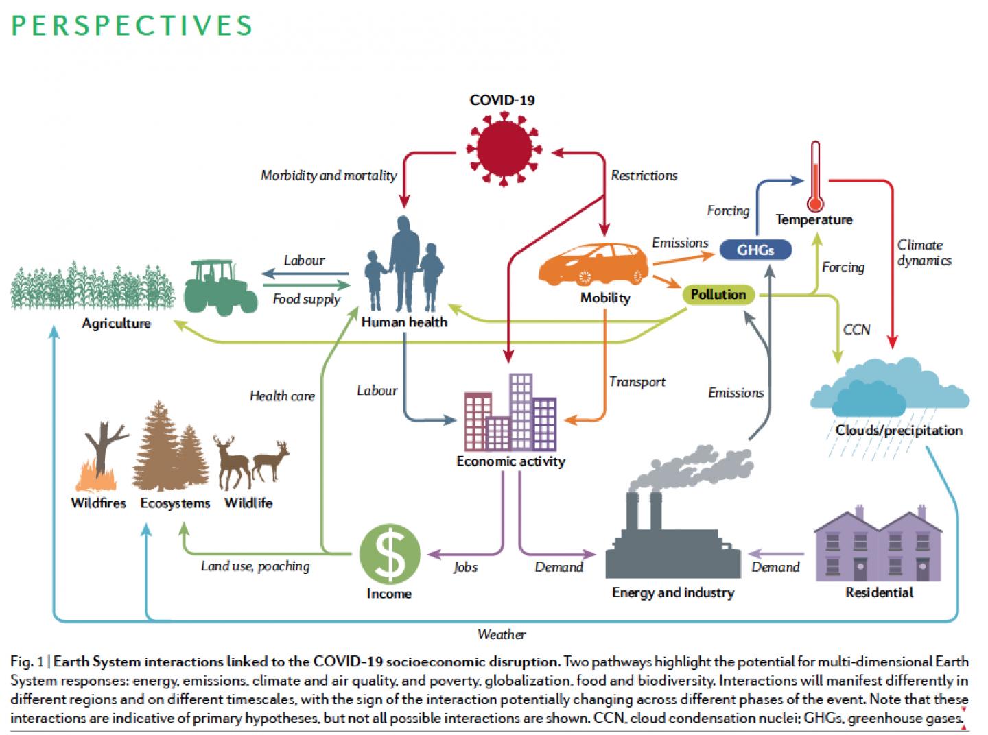 image: Illustration of interactions linked to the COVID-19 socioeconomic disruption along two pathways: 1.) energy, emissions, climate and air quality; and 2.) poverty, globalization, food and biodiversity.
