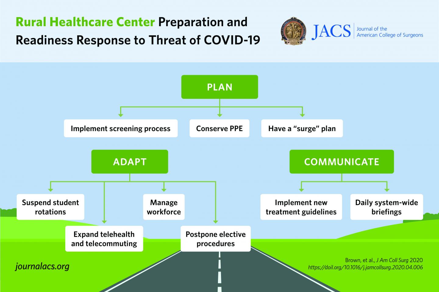 CHICAGO (April 10, 2020): Major metropolitan areas such as New York, Seattle, and Detroit have dominated news of the COVID-19 outbreak, but rural hospitals and health care systems must also prepare for a surge of coronavirus patients. Surgeons at one rural health care system on both sides of the New York-Pennsylvania border have reported on their preparedness response plan for dealing with the COVID-19 surge in an "article in press" appearing on the website of the Journal of the American College of Surgeons ahead of print. This rural surgery plan takes into account challenges unique to a rural population and geography, and it includes greater utilization of telehealth and coordination of resources and communications at affiliated centers spread over a large geographic area.