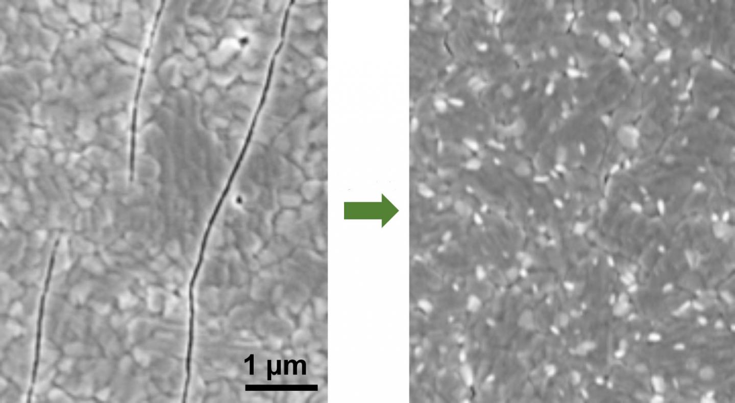 image: A cracked perovskite film (left) can be fully healed (right) with some compression of a little heat, new research shows. The findings bode well for the long-term reliability of perovskite films used in next-generation solar cells.
