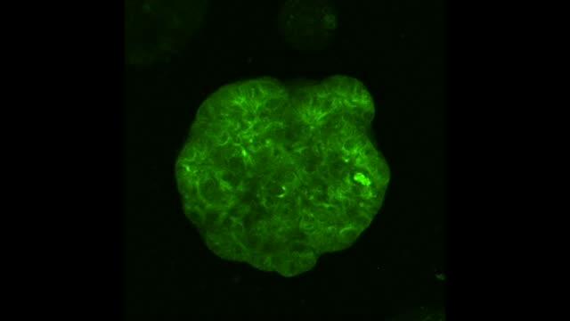 video: Through CRISPR-HOT, an important component of the cellular division process (the mitotic spindle) was visualized in green. First, a movie of cell division in a healthy liver organoid, then a movie of cell division in a liver organoid in which the cancer gene TP53 was disabled. The latter resulted in frequent abnormal divisions.