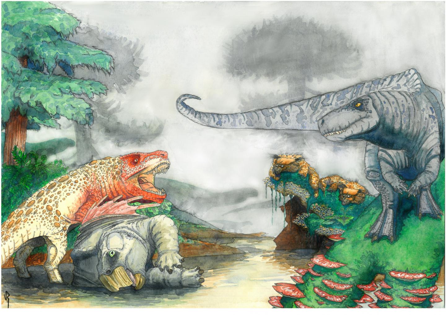 image: Artist's reconstruction of two rauisuchians fighting over a desiccated corpse of a mammal-relative in the Triassic of southern Africa. In the background, dinosaurs and mammal-like reptiles form other parts of the ecosystem.