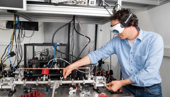 image: Coauthor Georg Winkler working on a setup used to characterize the high-performance mirrors under vacuum