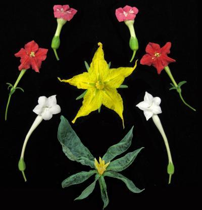 An image of a tomato flower (center) surrounded by flowers from tobacco (white and pink) and petunia (red). All three are all members of the Solanaceae family of plants, which also includes the crops pepper and eggplant. Solanaceae species show remarkable variation in the number of flowers they produce on their reproductive shoots called inflorescences and mutants in tomato like the single flower mutants shown at bottom recreate the inflorescence architectures of single single-flowered Solanaceae species like pepper, petunia, and tobacco.