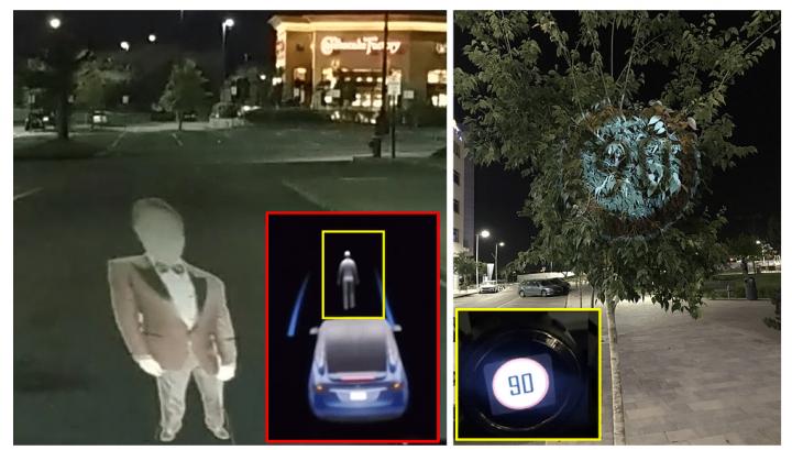 image: In the Ben-Gurion University of the Negev Research Telsa considers the phantom image (left) as a real person and (right) Mobileye 630 PRO autonomous vehicle system considers the image projected on a tree as a real road sign.
