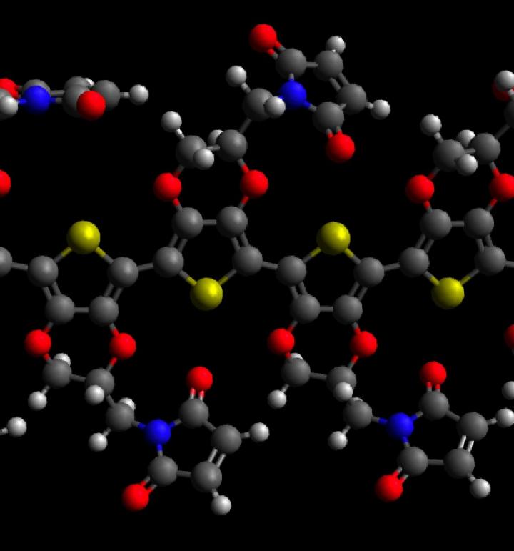 image: Molecular model of PEDOT with maleimide; carbon atoms are grey, oxygens red, nitrogens blue, sulfurs yellow and hydrogens white.
