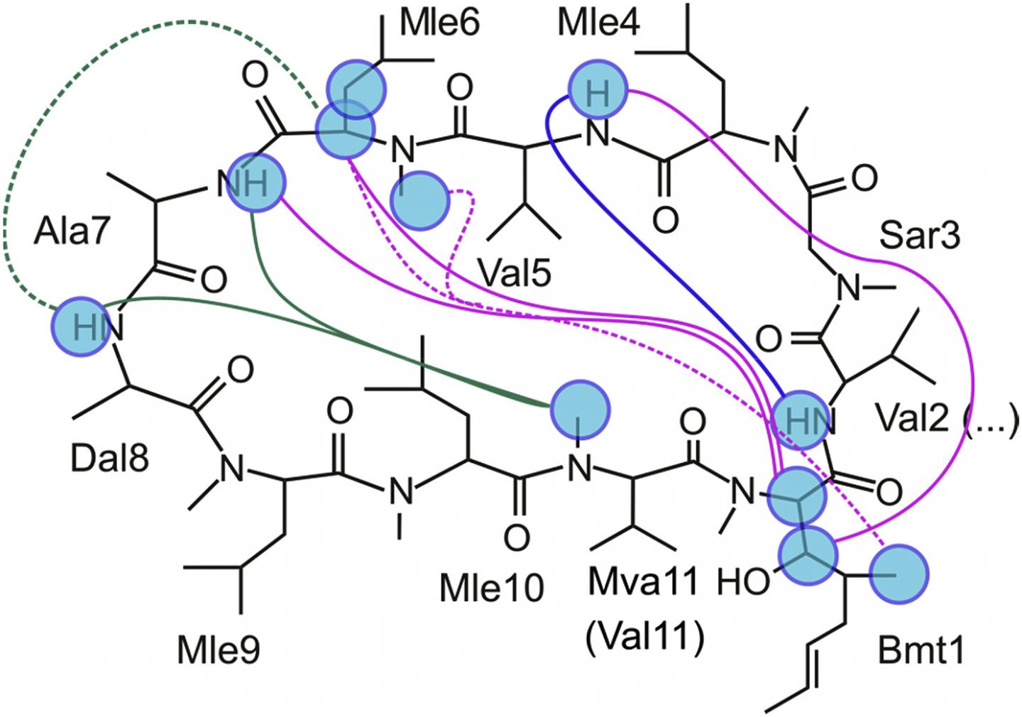 image: Long-range NOEs commonly observed in cyclosporins B-E in apolar media (solution in chloroform or in the complex with DPC micelles in water).