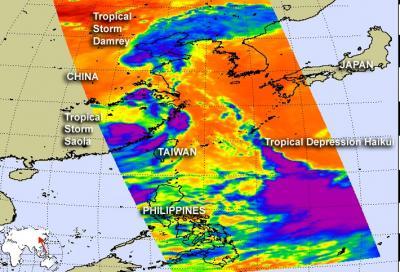 Tropical Storms Damrey and Saola are dissipating in China, while Tropical depression Haikui developed on Aug. 3, 2012. NASA's Aqua satellite passed over the northwestern Pacific Ocean on Aug. 3 at 0453 UTC (12:53 a.m. EDT) and the Atmospheric Infrared Sounder (AIRS) instrument captured all three tropical cyclones in one image. AIRS observes in infrared light, which basically provides temperature information.(Photo Credit: NASA JPL, Ed Olsen)