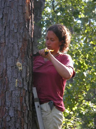 Researcher Sharon Martinson, Dartmouth College, studies bark from beetle-attacked trees in Louisiana to determine why bark beetle population outbreaks occur.