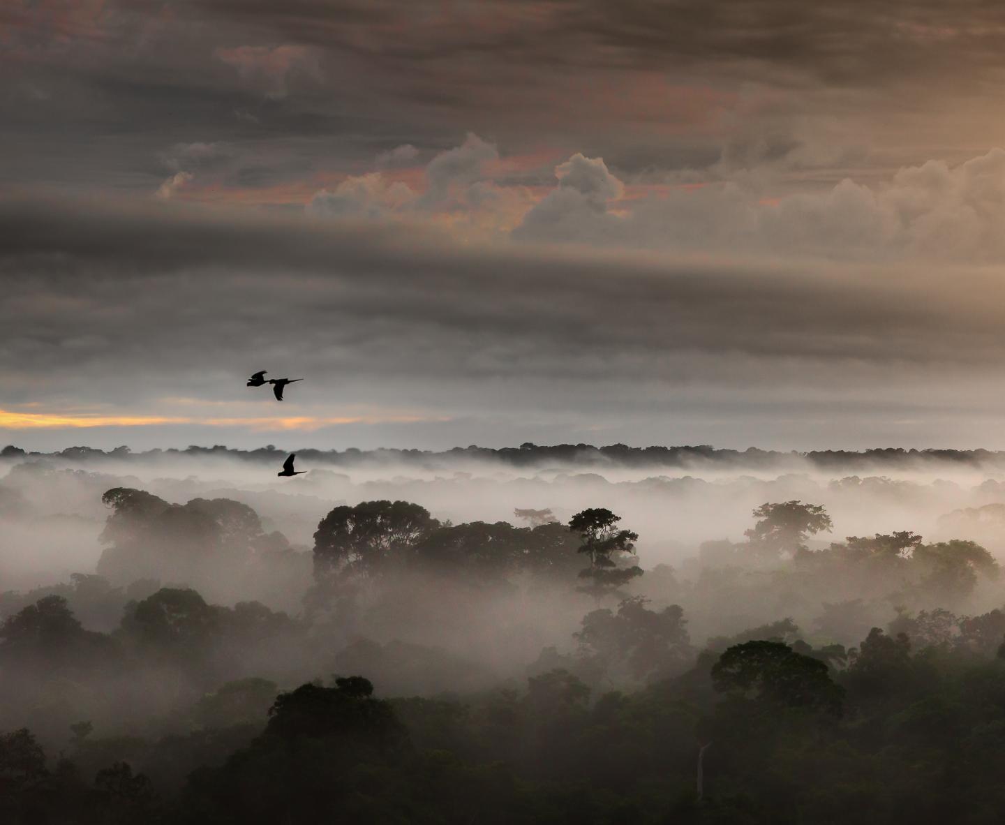 Macaws flying over the rainforest canopy at dawn. The study found that bird lineages that inhabit the forest canopy, such as these macaws, accumulate fewer species over evolutionary time than do bird lineages that inhabit the forest understory.