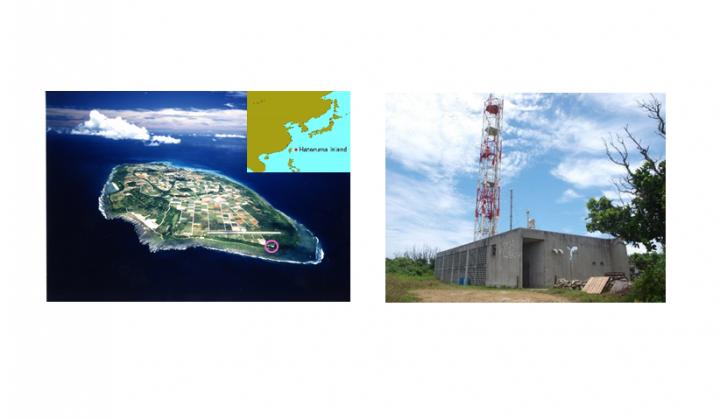 image: Birds-eye view photo of Hateruma Island (left) and the monitoring station on the island (right).
