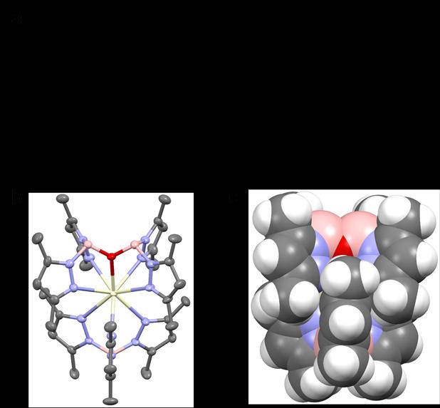 image: a. Synthetic route for the complex. b. Single crystal structure of the complex shown as ellipsoids at the 50% probability level, where yellow represents Ce, pink represents B, blue represents N, red represents O, grey represents C, and the hydrogens are omitted for clarity. c. Single crystal structure of the complex shown in a space-fill style, where hydrogens are shown in white.