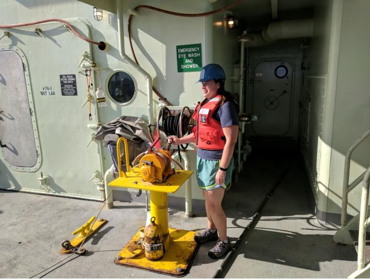 image: Trembath-Reichert running the winch for the CTD water sampler, which was used to bring fluids up to the ship from the bottom of the ocean.
