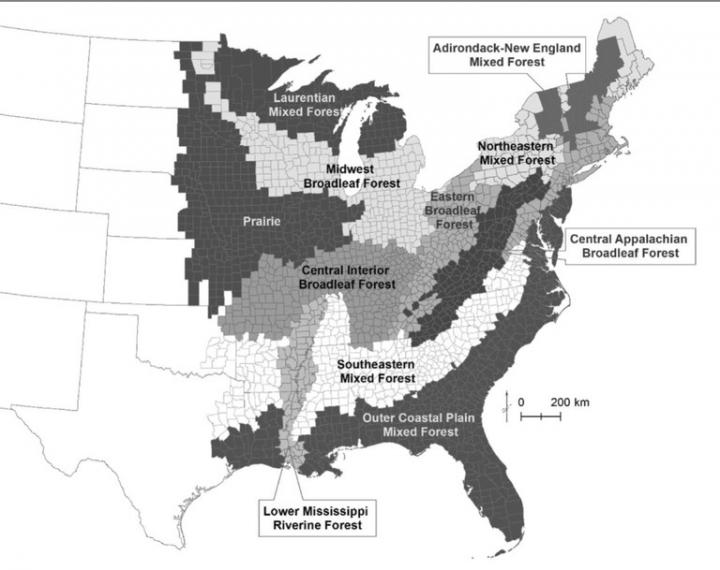 image: This map shows units where the researchers collected data from forest inventory areas maintained and surveyed every five years by the US Department of Agriculture Forest Service, along with forest types in the eastern United States.