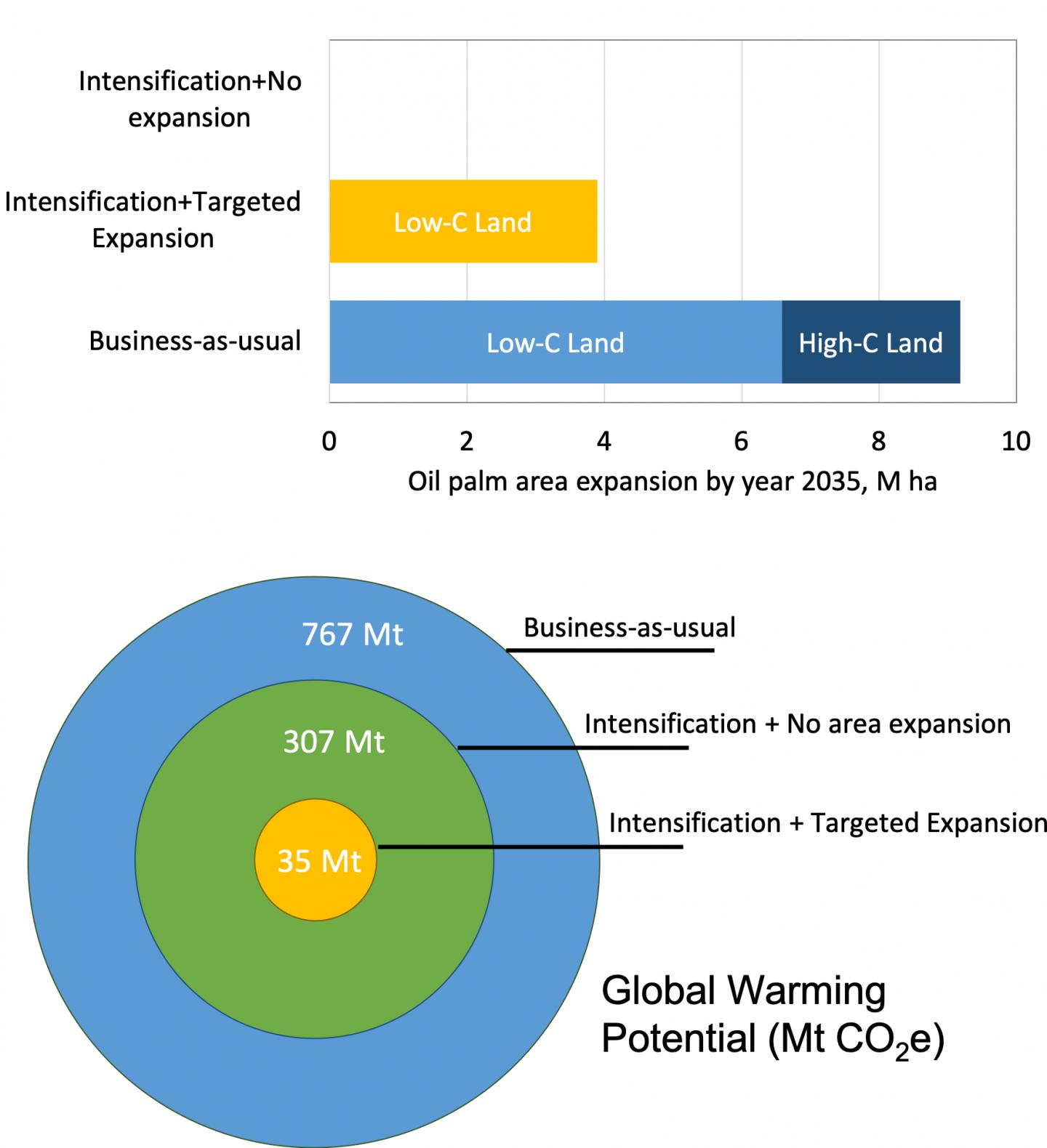 image: The top figure represents expected changes in low-C and high C land area conversion to oil palm production associated with three different development scenarios designed to match productive capacity with projected demand for Indonesia crude palm oil by 2035. The bottom figure shows the magnitude of Global Warming Potential (GWP) associated with each development scenario.