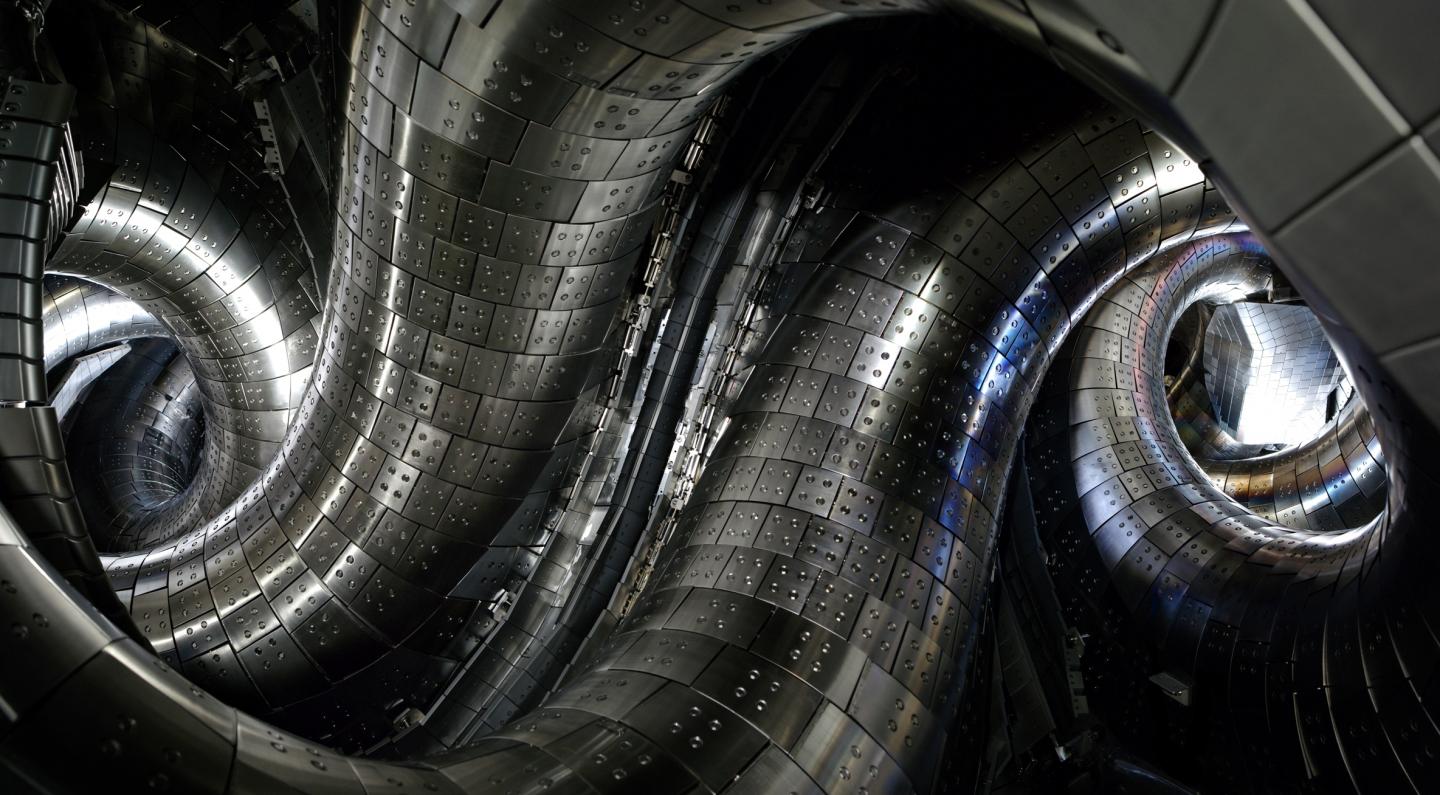 image: Inside of the Large Helical Device. High-temperature plasma is confined by the two helical superconducting coils.