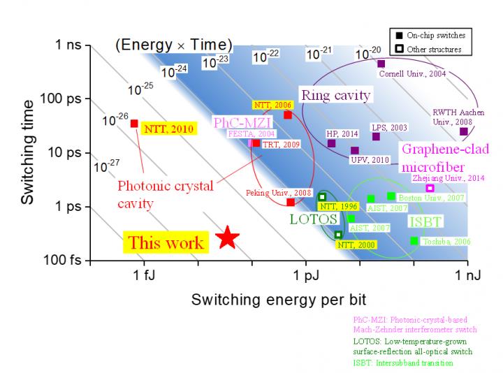 NTT and Tokyo Tech are working on overcoming the limitations of electronics, such as on the operation speed and energy consumption, by integrating a dense photonic network into a processor chip. The all-optical switch operates much faster than an electrically controlled one and consumes less energy. We expect that it will be used in future photonic integrated circuits for ultrafast information processing. As well, the nanoscale waveguide of the switch is a superior platform for developing nanophotonic information processing devices incorporating nanowires and other two-dimensional materials. Moreover, we envision that our device can be used as a nonlinear activation function in optical neural networks. In the future, we will increase the performance of the all-optical switch, apply its technology to other photonic devices such as detectors, and examine the use of other nanomaterials.