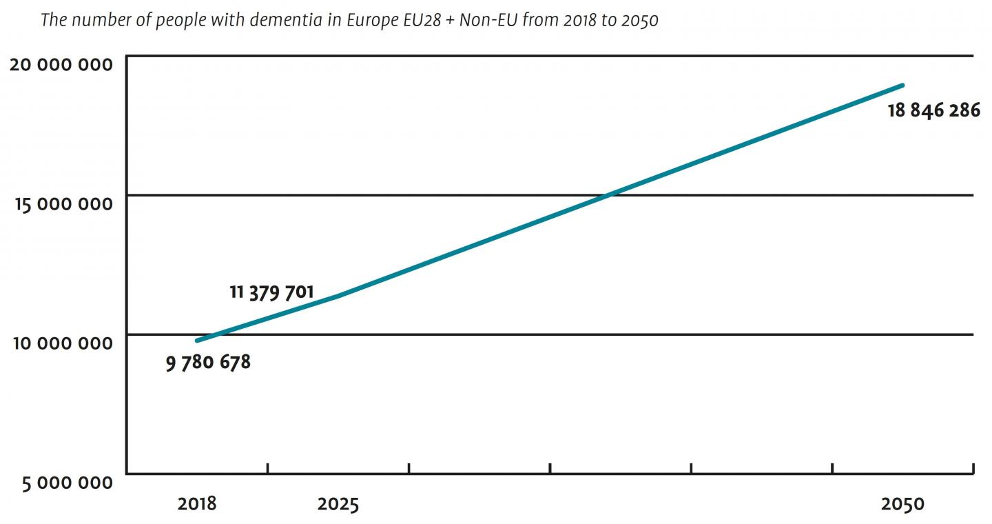 The number of people with dementia in Europe will almost double by 2050, increasing to 14,298,671 in the European Union and 18,846,286 in the wider European region.