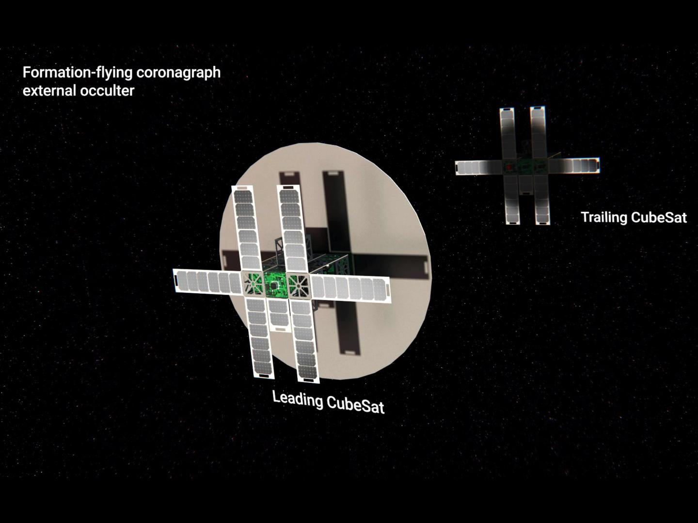 image: A 90 cm diameter external occulter extends (post-launch) from the sunward Leading CubeSat, resulting in an artificial eclipse falling on the anti-sunward Trailing CubeSat instrumentation, with a separation of 100 m. The pair of CubeSat's will fly in formation maintaining positioning via an ion propulsion thruster system throughout the 5-year mission lifetime. Uniquely, the Leading CubeSat serves as an occulter, as well as, housing instrumentation for solar observations of coronal magnetic fields.