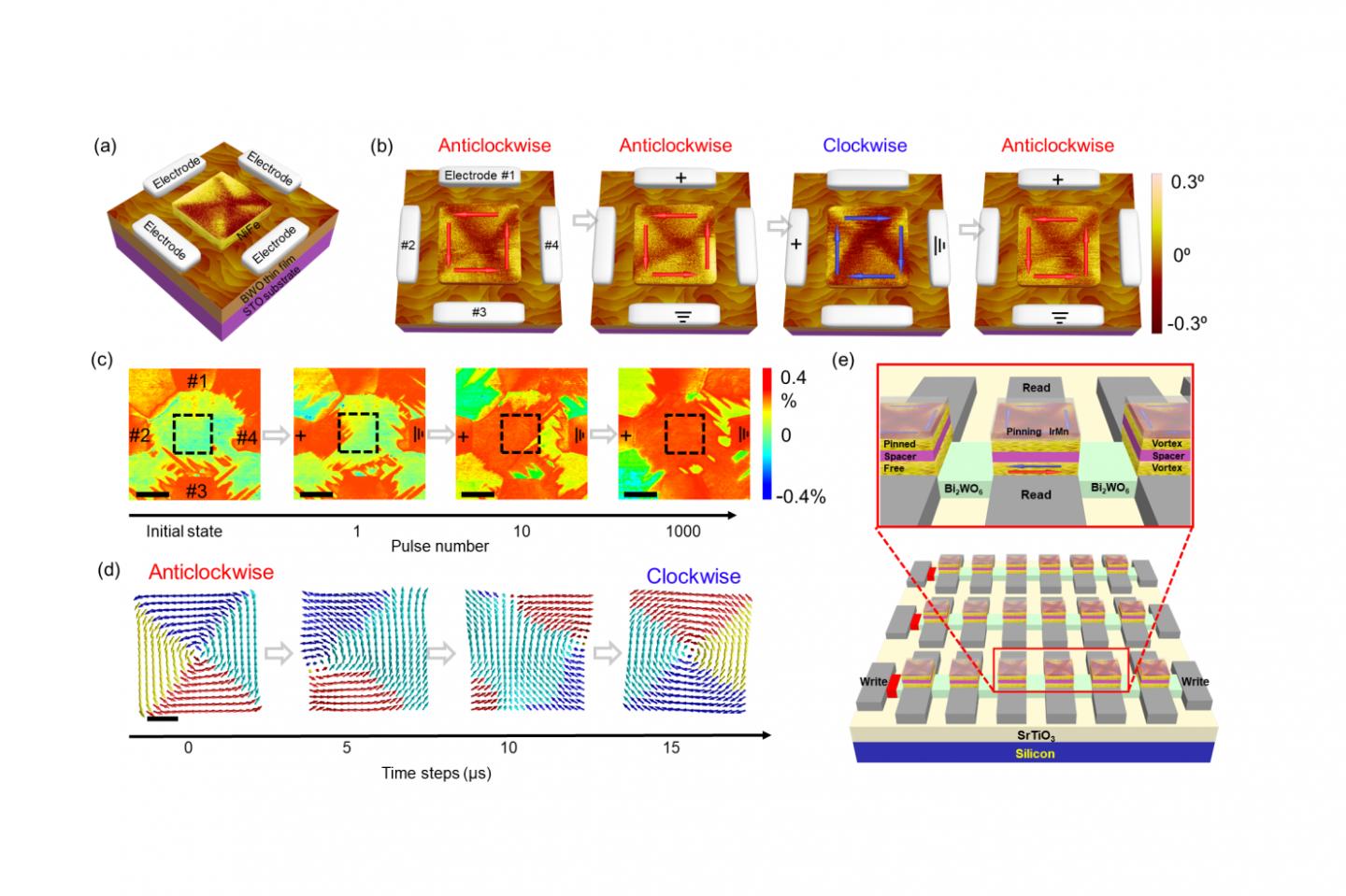 image: (a) A geometry of NiFe-BWO magnetoelectric thin film device with four planar electrodes. (b) The deterministically reversible reversal of single magnetic vortex circulation by bi-axial pulsed electric field. (c) The space-varying strain evolves as a function of pulsed electric field numbers. (d) Dynamic mechanism of magnetic vortex reversal. (e) Electric-field-controlled magnetic vortex based data-storage devices.