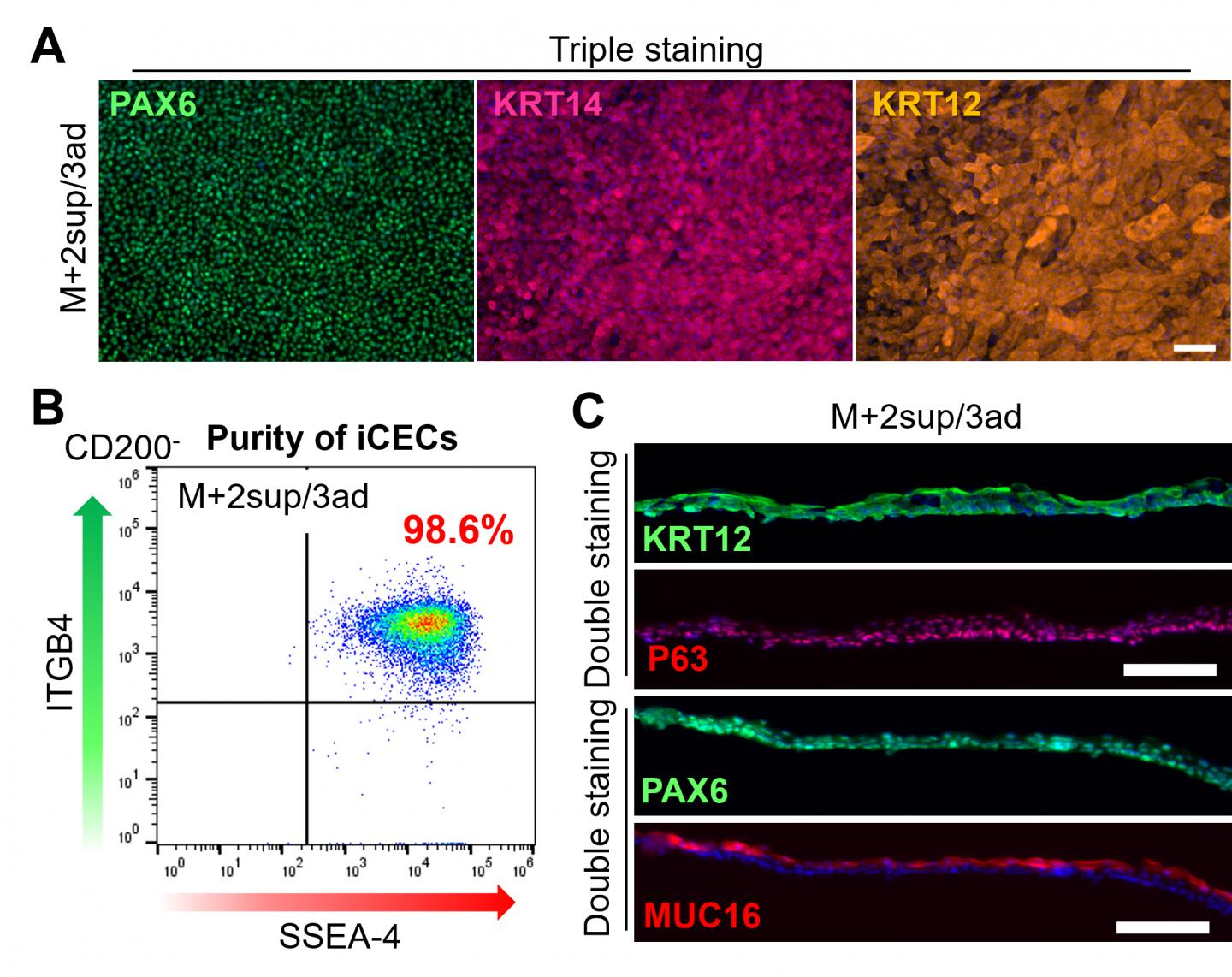 The researchers thus turned to magnetic-activated cell sorting (MACS), which allows the separation of cell populations using a magnetic field after coating specific surface proteins of cells with antibodies that carry magnetic nanoparticles. By first removing cells that produce the protein CD200 and then selecting for the cells that produce the cell surface marker SSEA-4 among the CD200- population, the researchers were able to separate most iCECs from non-CECs. To achieve high purity in iCECs, the researchers cultured these cells on LN221 and then on LN332 substrates, to further remove non-CECs and enable the adhesion and growth of iCECs only, respectively. The result was a highly purified corneal cell sheet.