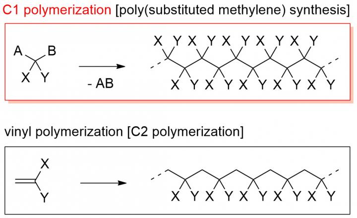 C1 polymerization is a useful technique for preparing polymers with a carbon-carbon main chain. This technique constructs a polymer backbone from "one carbon unit", in contrast to conventional vinyl polymerization, which produces polymers from a "two carbon unit" derived from vinyl groups. The representative characteristic of C1 polymerization is that it can yield carbon-carbon main polymers having a substituent on each main chain carbon atom [poly(substituted methylene)s]. For the C1 polymerization system, diazoacetates are suitable monomers, yielding polymers with an alkoxycarbonyl group (ester) on each main chain carbon atom.