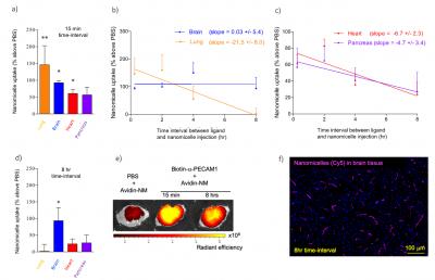 image: Short time-intervals (15 mins) between injection of biotin-PECAM1 antibody and injection of avidin-decorated nanomachines (avidin-NM) results in avidin-NM targeting to the lung (yellow), brain (blue), heart (red), and pancreas (purple) (a). However, targeting to peripheral organs decreases as a function of time-interval length, while targeting to the brain remains constant (b, c). Consequently, an 8h time-interval results in specific targeting of avidin-NM to the brain, with no targeting seen in peripheral organs (d). Avidin-NM accumulation was visualized in freshly excised brains (e) and fixed brain tissue (f).