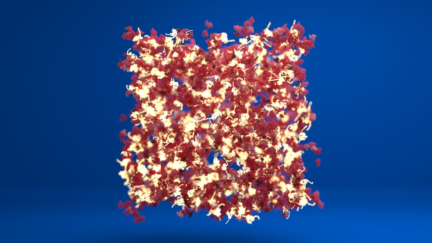 image: A schematic of a protein hydrogel showing regions of folded protein (in red) connected by regions of unfolded protein (in white).